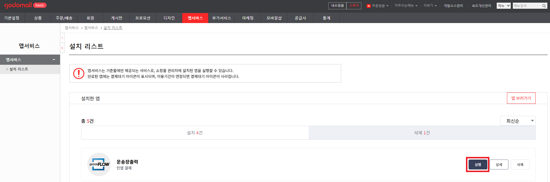 3. 고도몰 관리자사이트에 접속 후 상단 "앱서비스" 에 접속합니다