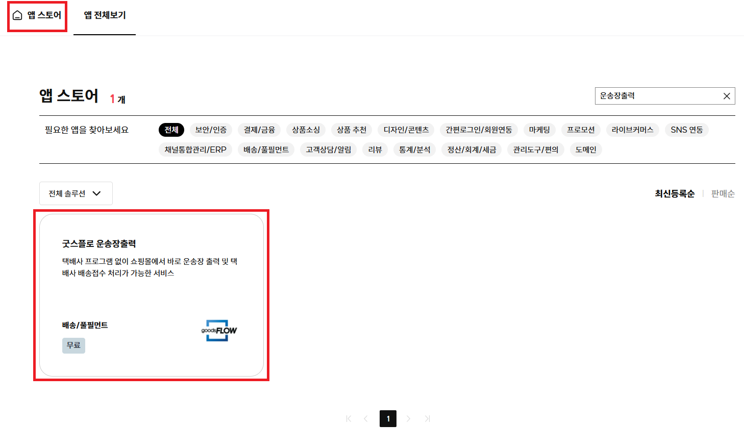 2. [앱 전체보기] 메뉴 클릭 후 우측 상단 검색 영역에 [운송장출력]을 입력하고 검색 후 설치합니다.